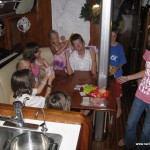At Salt Pond, we said goodbye to Ohana, but welcomed Safari Tu, a Gulfstar 44 with kids on it. We also discovered a great bay for conch harvesting and pulled in enough conch to make a delightful conch fritter dinner for the 19 folks on our four boats. While the men folk cleaned the conch (stay tuned for a photo essay on this process) and prepared the fritters on Stolen Hour, the ladies were on Bojangles preparing dough for the next day’s baguettes. We had a great dinner and a great baguette and cheese breakfast the next day…. (You can see, we’re really roughing it out here!)